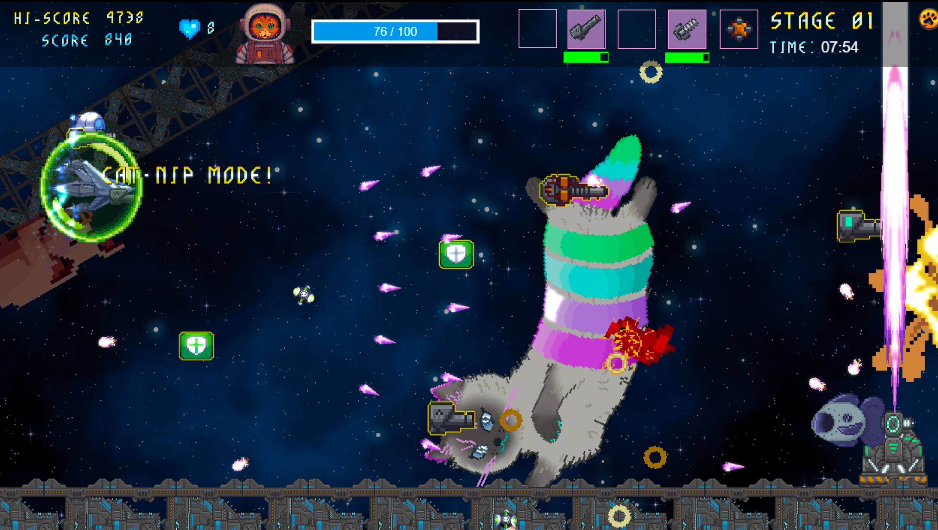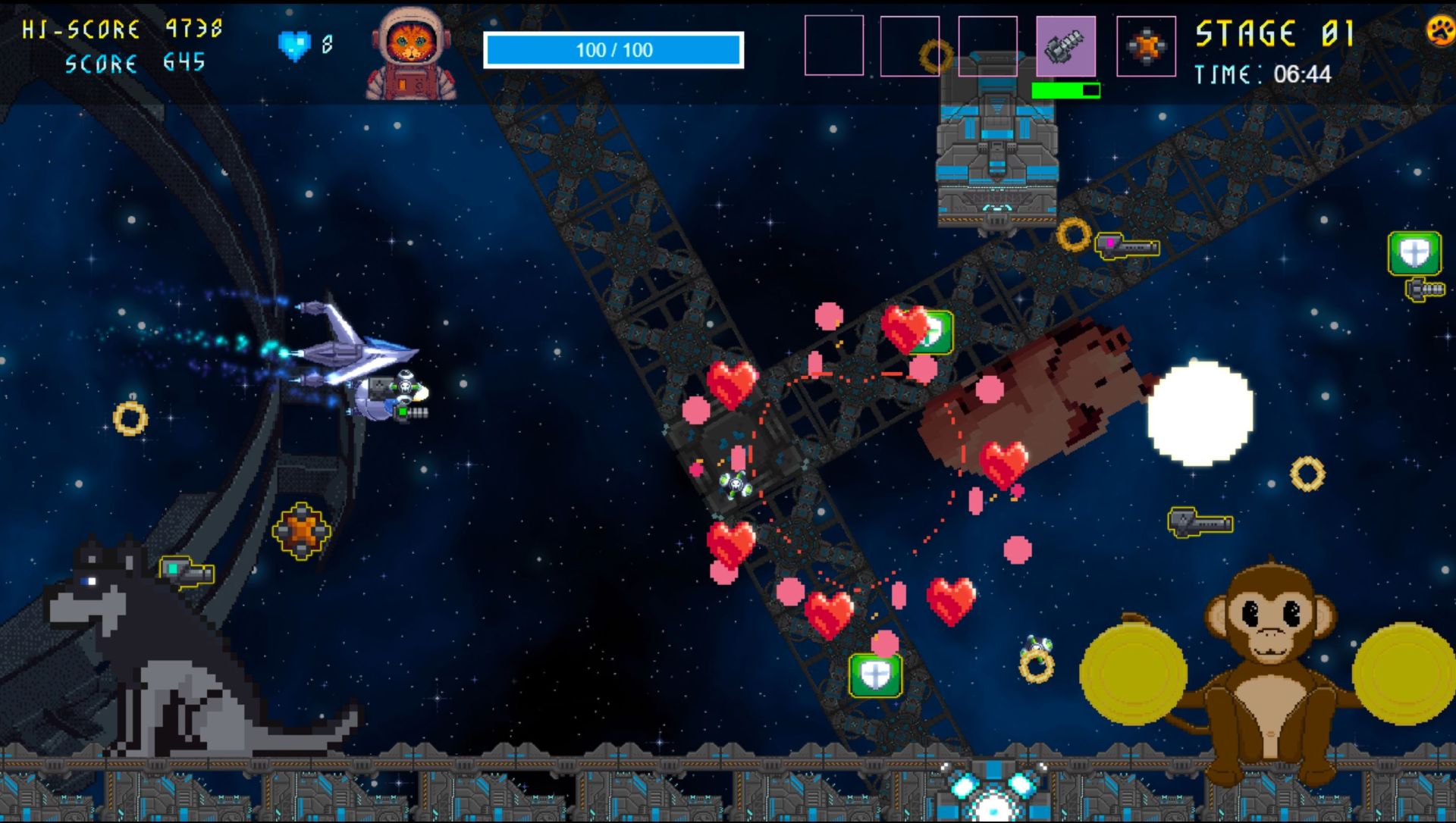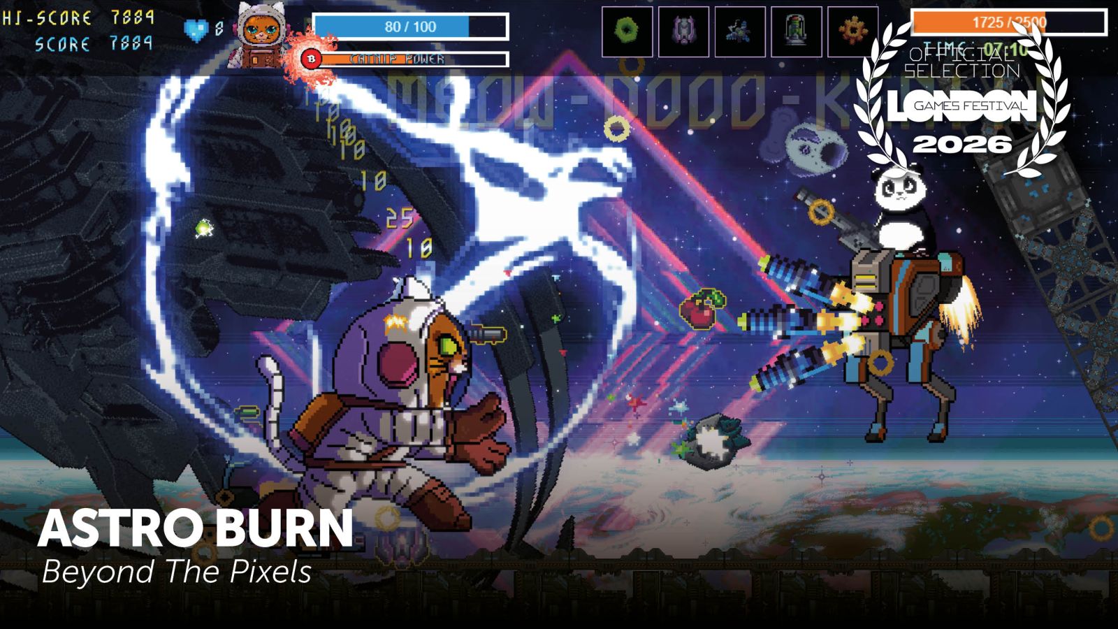 Astro Burn is a fast-paced sci-fi cute-em-up filled with colourful bullet-hell chaos and giant adorable animals in huge mechs. Play as Astro a space cat along with your robot companion, as you blast, dodge, upgrade, trigger Catnip Mode, and take down screen-filling cute critters overload in retro arcade style.